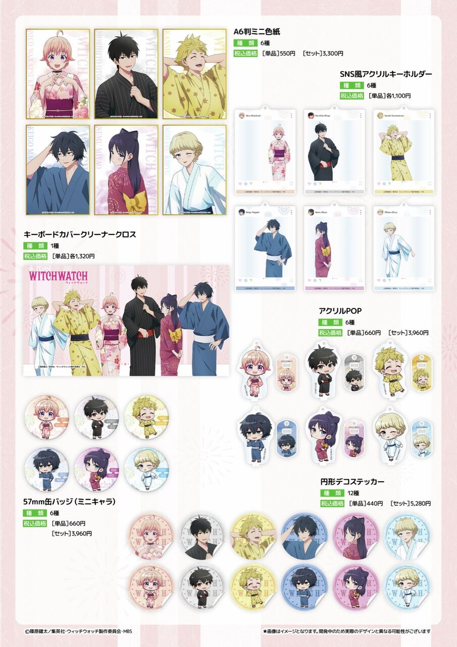 アニメ「ウィッチウォッチ」ポップアップストアでは、浴衣に身を包むニコやモリヒトたちの描き下ろしイラストを使用した新作グッズが多数販売される他、グッズをお買い上げ2,000円(税込)ごとに「イラストカード(全6種)」もしくは「ミニキャライラストカード(全6種)をランダムに1枚プレゼント!